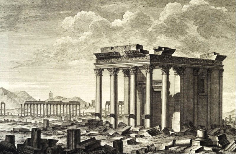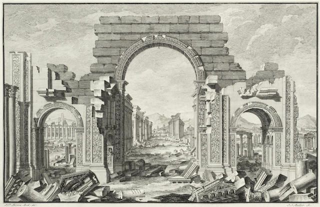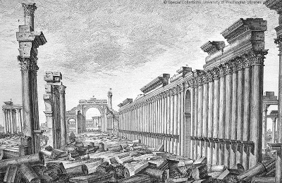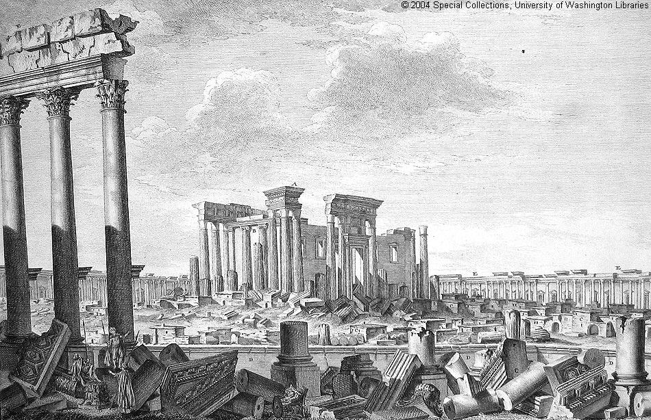 After Rome fell, the city became part of the Byzantine Empire and later the Islamic Umayyad Caliphate, but never recovered its glory as a Roman outpost. Though the ancient part fell into ruins, it still retained much evidence of thousands of years of cultures from east and west. Irish antiquarian Robert Wood re-discovered the site publishing The Ruins of Palmyra in 1757 complete with 57 drawings by Italian artist Giovanni Batista Borra. The book generated a sensation across Europe, especially in England, then in the midst of the Neo-Classical Era. Borra’s almost photographically accurate drawings influenced European and even American architects. Thomas Jefferson, for example, suggested the Portico of Diocletian as the model for the East Portico of the US Capitol.